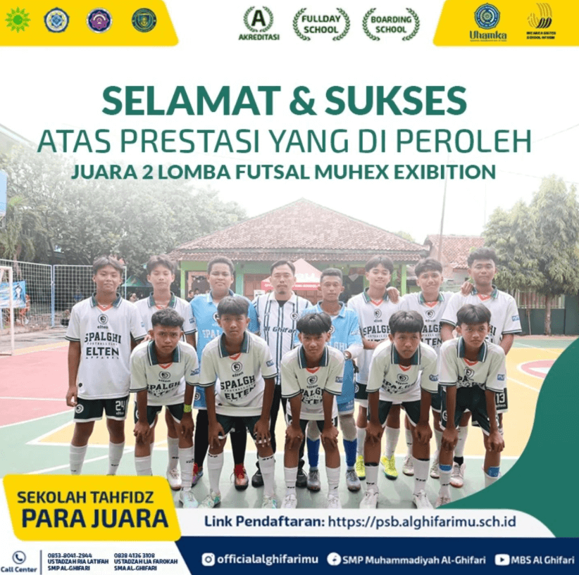SMP Muhammadiyah Al-Ghifari kembali membuktikan jati dirinya sebagai “Sekolah Tahfidz Para Juara”. Tim futsal sekolah yang dilatih oleh Tadz Mandala P. Marga, M.Pd, bersama asisten pelatih Wahyu, berhasil meraih Juara 1 di Open Tournament Futsal KOMEKS SMA 6 Metro. Prestasi ini tidak hanya menjadi kebanggaan sekolah tetapi juga bukti nyata bahwa pembinaan siswa kami mencakup pengembangan bakat di berbagai bidang, termasuk olahraga bergengsi seperti futsal.